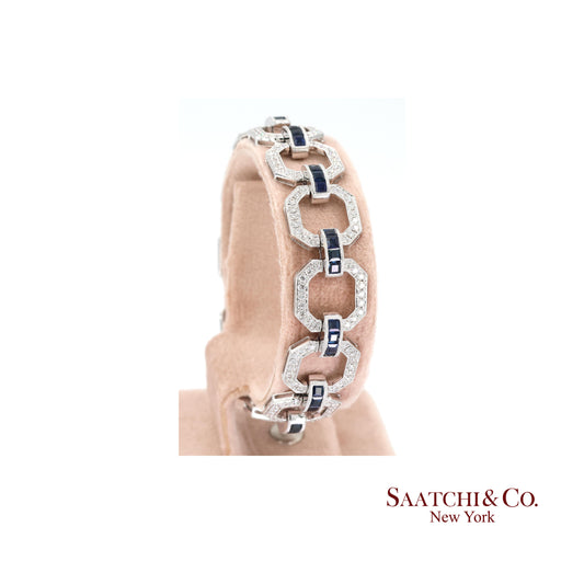 18k Sapphire Diamond Bracelet Womens White Gold 7.42in Milgrain Art Deco