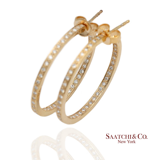 18K(750) Solid Yellow Gold In and Out Natural Diamond Hoop Earrings