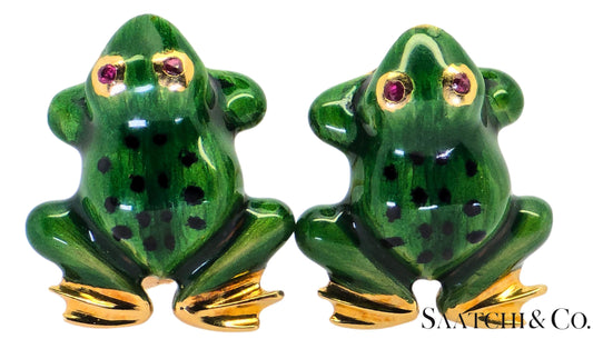 18K (750) Yellow Gold - Enamel & Natural Ruby, Round Brilliant Cut: Frog Earring