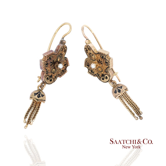14K Yellow Gold Pearl Enamel Dangling Earring