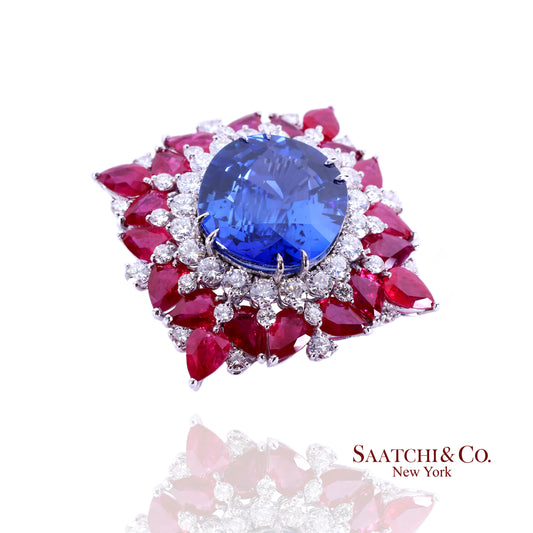 Gubelin Certified 18K White Gold Natural Sapphire Ruby and Diamond Brooch / Pendant