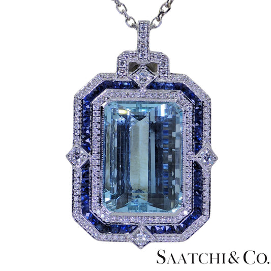 18K (750) White Gold - Natural : Aquamarine Stone, Diamond And Sapphire Pendant