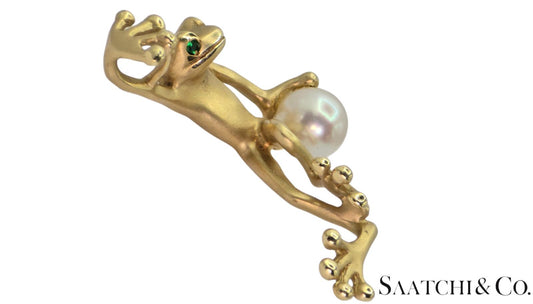 18K (750) Yellow Gold - Frog Shape Unique Pendant -Natural White Pearl & Emerald