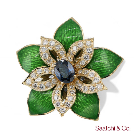 18K (750) Yellow Gold Green Enamel Sapphire Diamond Pin / Brooch