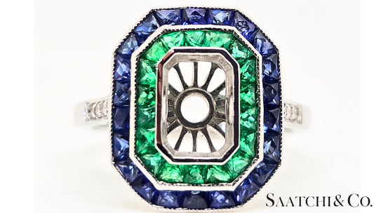 18K White Gold, Natural Diamond Emerald and Sapphire ring Mount, 4.3 Grams
